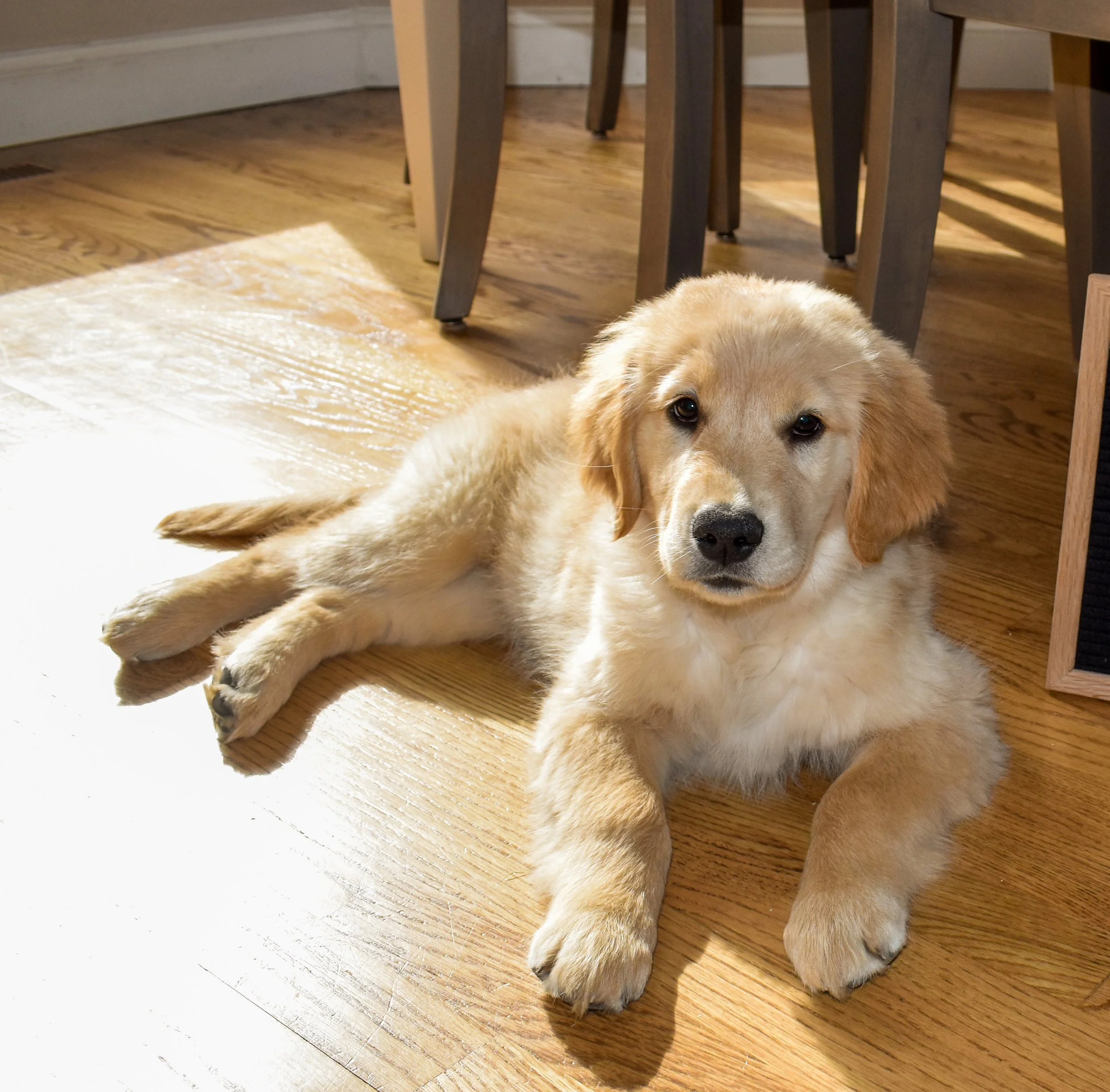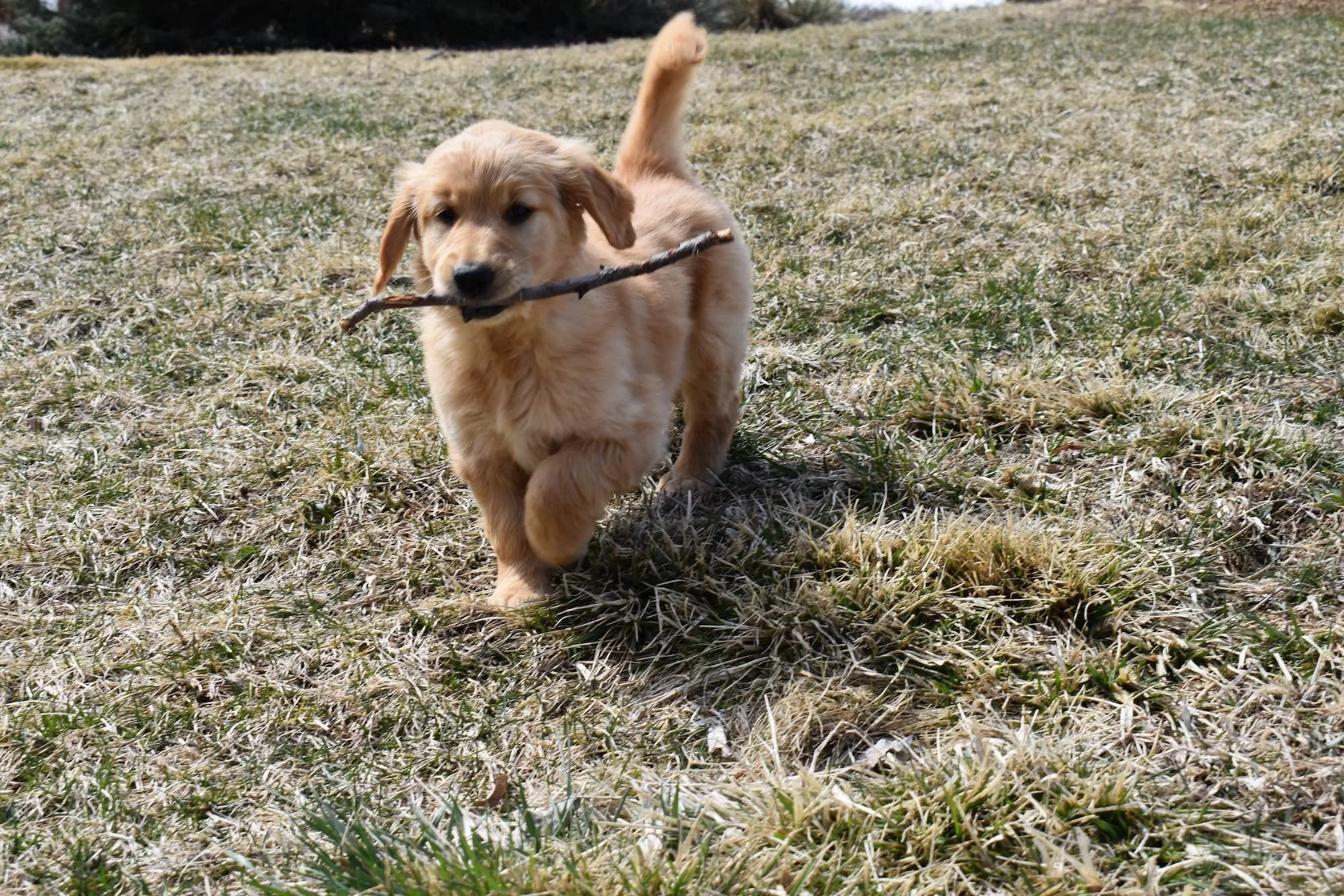 June (or June Bug) is one of our foundation dams. Her gentle, loving temperament and strong maternal instinct are some of her most notable qualities. She is very observant and eager to please. June has a sweet face and soft expression. She is well-balanced, has a beautiful golden coat with some wave and moves smoothly with her effortless gait. After her final litter this spring, we hope to focus on obedience and scent work with her.